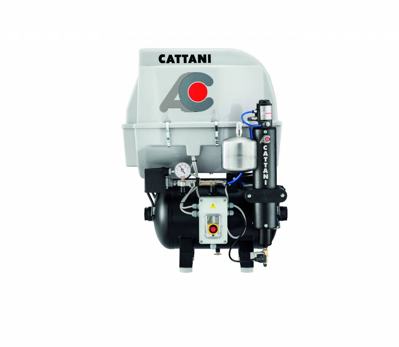 Cattani AC100 on ühesilindriline õhukuivatiga ja mürakattega kompressor ja mürakate, mis ei tarbi õli ja on võimeline tootma kuiva steriliseeritud suruõhku. Kompressor on mõeldud kasutamiseks mitte enama kui ühe operatsiooni ajal korraga. Kompressoril on 5 aastane garantii.